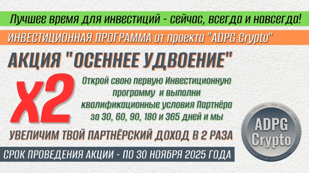Период проведения Акции – по 30 ноября 2025 года. Каждый Инвестор, открывший первую Инвестиционную программу в период проведения Акции на любую сумму от 120$ до 600$ и выполнивший квалификационные условия для получения Партнёрского дохода в течение установленного условиями Акции срока, получает удвоенный Партнёрский доход. Срок для выполнения квалификационных условий Партнёра устанавливается: Течение установленного срока начинается в 00:00 часов дня начала срока действия первой Инвестиционной программы, открытой Инвестором. В случае, если Инвестор при выполнении квалификационных условий Партнёра пропустил установленный Акцией срок на любом этапе, то дальнейшее участие такого Инвестора в Акции прекращается. Пример 1: Инвестор открыл первую Программу 27 августа 2025 года. В течение 25 дней (по 20.09.2025) он выполнил условия Партнёра 3 ранга и получит удвоенный Партнёрский доход 100х2=200 USDT (200$); В течение 57 дней (по 22.10.2025) он выполнил условия Партнёра 2 ранга и получит удвое