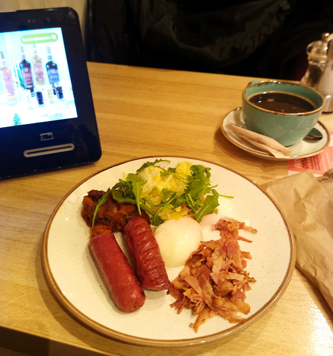 Яйцо-пашот, говяжьи колбаски, жареный бекон, салатные листья, фасоль.