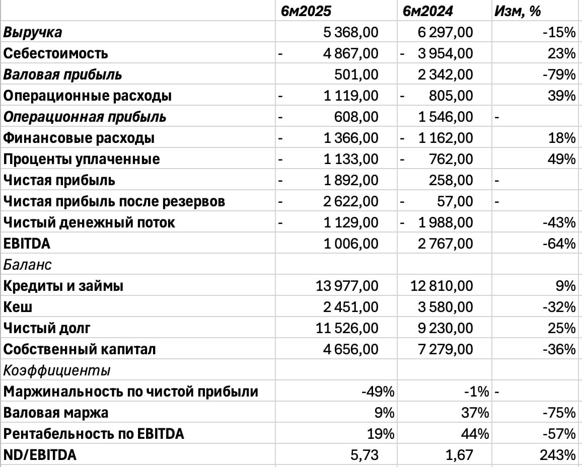 Отчет Whoosh. Приехали Погода плохая, настроение на рынке плохое, ну и отчет Whoosh решил не выбиваться из общей канвы. Финансы · Выручка за первое полугодие — 5,3 млрд (-15% г/г). При этом, выручка в РФ сократилась на 26%, зарубежная выручка выросла на 91% г/г. · Валовая прибыль сократилась до 0,5 млрд (-79% г/г), валовая маржа — 9% против 37% годом раннее. · Операционные расходы — 1,1 млрд (+39% г/г) · Компания получила операционный убыток в 0,6 млрд против 1,5 млрд опер. прибыли в прошлом году · Уплаченные проценты — 1,1 млрд (+49% г/г) · Чистый убыток -1,89 млрд против прибыли в 258 млн годом раннее. С учетом резервов под хедж и валютные колебания, получаем 2,6 млрд убытка. ·EBITDA кикшерринга сократилась до 1 млрд (-64% г/г). Рентабельность сократилась до 19% с 37% в 2024. · Чистый долг увеличился на 25% до 11,5 млрд рублей. ND к форвардной EBITDA — 5,7x. Если брать LTM показатель — 2,99x Вывод Если предположить, что второе полугодие компания отработает с таким же результатом