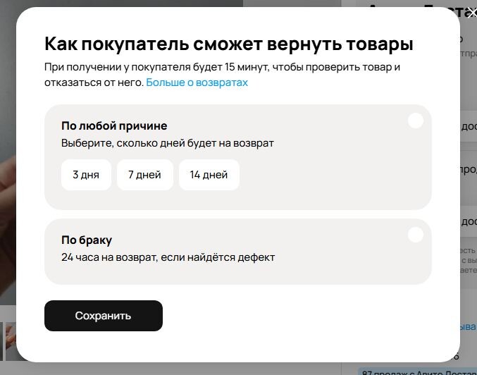 Это обновление представлено на Авито в виде опции, то есть вы можете игнорировать этот момент с возвратом. Теперь есть возможность выбрать срок возврата товара: 3 дня, 7 дней, 14 дней или 24 часа по браку.