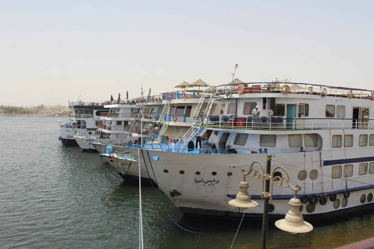 У пристани лайнеры стоят друг за другом почти вплотную. Туристы проходят через все до своего лайнера.