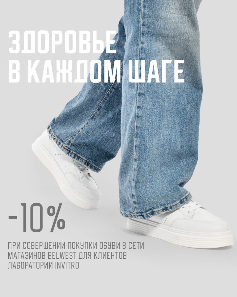 Здоровье и стиль в каждом шаге! 🤍 Мы рады сообщить Вам о проведении совместной партнерской акции с INVITRO, объединяющей здоровье и стиль. В период с 26.08.2025 по 30.09.2025 при покупке обуви в фирменных магазинах Belwest вы можете воспользоваться чек-купоном на дополнительную скидку 10% на медицинское обслуживание в INVITRO. Не упустите шанс позаботиться о своем здоровье и выглядеть стильно. *акция проходит на территории Республики Беларусь
