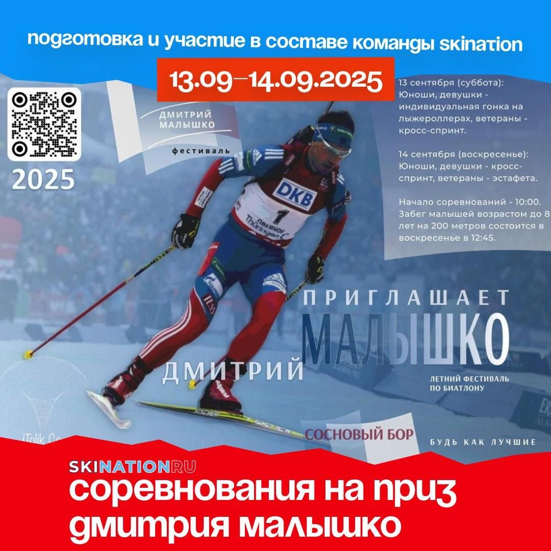 БИАТЛОН СОРЕВНОВАНИЯ на призы Д. МАЛЫШКО Дорогие спортсмены, приглашаем вас принять участие в соревнованиях по пневматическому биатлону на призы Дмитрия Малышко в составе команды Skination 🥇 🏆 Соревнования пройдут 13 и 14 сентября на биатлонном комплексе «Малахит», д. Липово Сосновоборского района Ленинградской области Дистанции короткие и принять участие сможет спортсмен любой подготовленности! 🙌 🏁 Программа соревнований предусмотрена для спортсменов 4 возрастных групп: 🔸2009-2010 г.р. (роллер-гонка, кросс-спринт) 🔸2011-2012 г.р. (роллер-гонка, кросс-спринт) 🔸2013-2014 г.р. (кросс-гонка, кросс-спринт) 🔸1994 год рождения и старше (кросс-спринт, парная кросс-эстафета) 🔸2018 и младше 200 метров 📌 Для всех желающих поучаствовать: наши тренеры проводят тренировки по биатлону на базе УТЦ Кавголово каждую субботу в 8:00 (группа Атлет) и в воскресенье в 13:00. До 31 августа принимаем ваши заявки на участие в составе команды от клуба Skination, в дни соревнований предоставляем