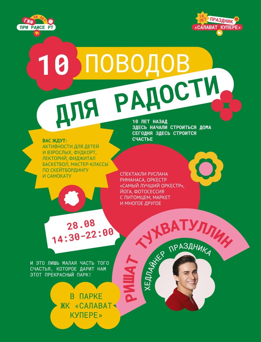 Приходите на фестиваль «10 поводов для радости» 🌳 Праздник посвящен 10-летию жилого комплекса «Салават Купере» и 30-летию Государственного жилищного фонда при Раисе Республики Татарстан. В программе: - Выступления на концертной сцене: DJ Bubblegum, ILGIZ, BEKU, Хопелес, K3DERT, NEKAYA, JAWS BEAT, BARBARA BAND, а также Ришат и Алия Тухватуллины. - Театральное шоу от Руслана Риманаса. - Интерактивные зоны и мастер-классы (в том числе «Простые фокусы»). - Соревнования по скейтбордингу и самокату. - Буккроссинг и лекторий. - Маркет и фудкорт. Весь день — творческие мероприятия, музыка, общение и отличное настроение! 📆 28 августа с 14:30 до 22:00 📍 парк жилого комплекса «Салават Купере» 🎟 Вход свободный Подробное расписание и регистрация на лекции и мастер-классы доступны по ссылке #чакчаксобытия Чак-чак Норрис