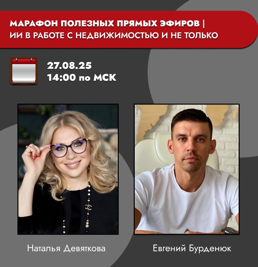 🤖 ИСКУССТВЕННЫЙ ИНТЕЛЛЕКТ В НЕДВИЖИМОСТИ: МИФ ИЛИ РЕАЛЬНОСТЬ? Друзья, продолжаем наш марафон полезных прямых эфиров! 📌 ЧЕРЕЗ 10 МИНУТ В 14:00 (мск) состоится эфир с Евгением Бурденюком https://t.me/real_estate_ru — CEO компании «Отелит», председателем Ассоциации малых торговых центров и «Человеком года» Новосибирской области. Тема эфира: «Искусственный интеллект в работе с недвижимостью и не только» Что обсудим: ▪️ как AI помогает оценивать состояние объектов недвижимости ▪️ что реально изменилось после внедрения этой технологии ▪️ как всё это работает на практике ▪️ возможности применения ИИ не только в девелопменте, но и в бизнесе в целом Сегодня ИИ звучит повсюду, но важно понимать: это не просто хайп, а инструмент, который может кардинально повлиять на эффективность бизнеса и доходность проектов. 🗓 Подключайтесь в 14:00 (мск)! ✅ Ссылка на эфир: https://telemost.yandex.ru/j/9231322605 Вопросы и обратную связь можете писать в комментариях под этим постом или в чате трансляц