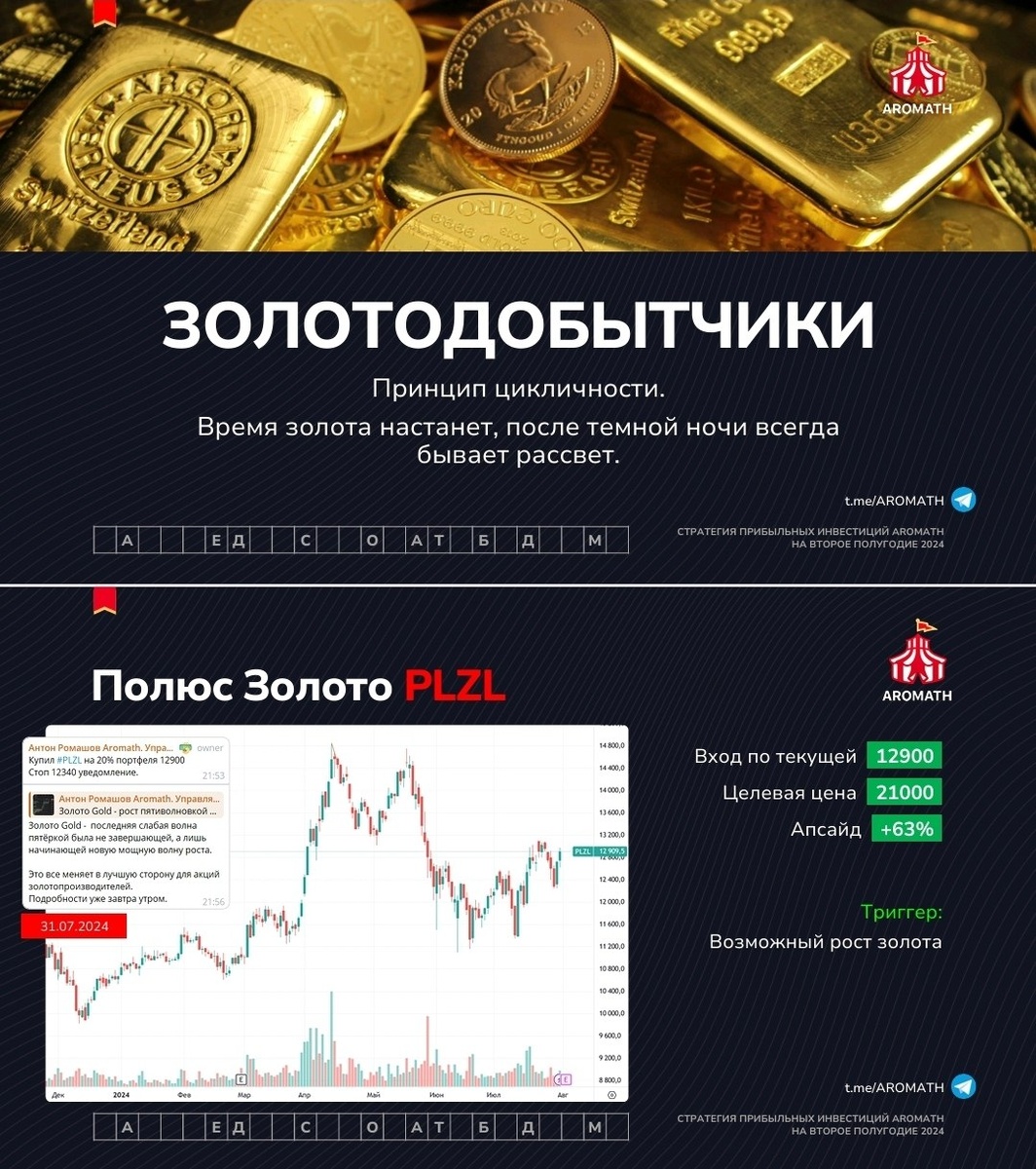 Интересно, что ровно год назад 1 августа 2024 года на БМВ Аромат стратегия прибыльных инвестиций на второе полугодие 2024 года давал идею в #PLZL Полюсе по цене входа по текущим тогда 12900 с целью 21000 рублей 🏆 После этого произошёл сплит акции, выплачен был дивиденд большой, а цена уже достигла первой цели, солидно прибавив и обогнав рынок значительно, став абсолютным топ-пиком номер 1, теперь ее любят все аналитики и брокеры. Нам интересны сделки только с большим апсайдом от 30+%, чтобы реально заработать, а не пипсы ловить, потому что мы ловим большую рыбу доходности только тогда и там, где и когда она есть.