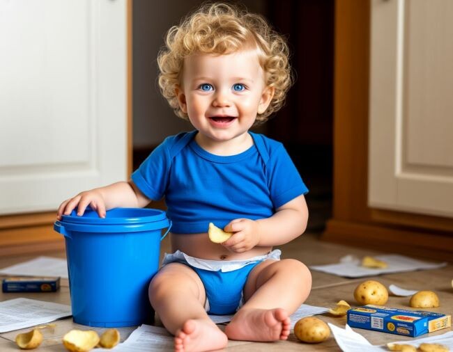 Любопытство горело в его глазах, когда он опрокинул ведро, рассыпав его сомнительное содержимое по всему полу – пестрый калейдоскоп забытых остатков. На его розовых щечках сияла довольная улыбка.