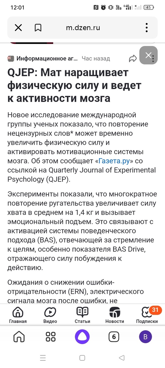 Друзья! Я в панике, правда Караул Был обычный будний день - полезла в приложение банка через мобильную версию браузера, и тут я увидела статью на главной странице Яндекс.Новости Про то что "мат наращивает физическую силу"... о нет, что? Это что ж получается? Говорить матами - полезно? Не получается что-то? Матюкнись и попробуй заново Не можешь поднять штангу - матюкнись - и она поднимется легко... Мне не понравилось что в статье не было ни описания кто участвовал в выборке, как проводилось исследование. Чтобы такое заявлять нужны основания, факты, цифры. Эксперимент должен фиксироваться, данные должны быть практическими Что это значит для обычного человека? да 90% прочитает и поймет это ровно так как в моем заголовке статьи - что материться хорошо, это влияет на физическое состояние в положительном ключе Простыми словами: обругал кассиршу за то что она медленно работает? Она тебе в ответ тоже ругнулась? Все хорошо! Теперь она подзарядилась и начнет работать лучше :) Дай ей возможнос