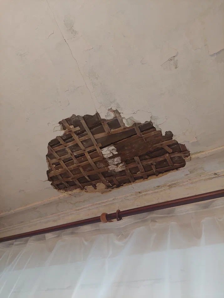 Несколько дней назад из-за гнилых деревянных перекрытий в квартире обвалилась часть потолка, затем это повторилось и дыра увеличилась (фото 1-3).