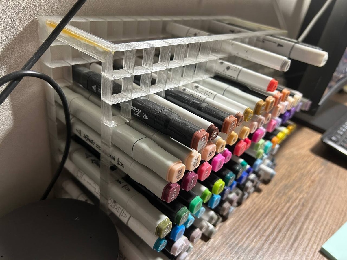 В подарок на новый год решил сделать девушке подставку для маркеров. Она их хранила в коробке из под обуви штабелями, вытянув один - все остальные выше норовили упасть на уровень ниже из-за отсутствия полки под каждый. Последний опыт конструировании в Компас был в университете 10 лет назад. Прошло 2,5 года как эта модель все еще существует у нас дома, но в самой модели я бы проработал одну деталь: закрыл по краям окошки, чтобы пыль не скапливалась на маркерах. Если вдруг кто сделает, то буду рад если поделитесь. Очень прошу все замечания обязательно напишите в комментариях)Печатал в местной копирне www.3d-evolution.ru на большом принтере, перед распечаткой мастер предложил разделить 3д модель на 2 части, чтобы не тратить много пластика на поддержку, а затем склеить специальным клеем, который твердеет от ультрафиолета, и на всякий случай усилили грани соединителей. К сожалению, клей со временем дал желтоватый оттенок.Вещь с виду хрупкая, но, при аккуратном владении, пережил 2 переезда.