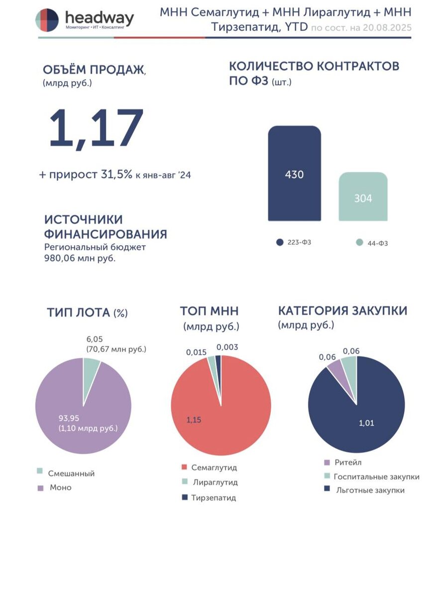 На днях разошлась новость, что у российских дженериков с действующим веществом семаглутид обнаружили отклонения в ДВ и количестве примесей. Росздравнадзор опроверг эту информацию, но тем не менее будем наблюдать за развитием событий и ходом возможных проверок. А мы напоминаем, что недавно готовили аналитический обзор на тему госзакупок препаратов от ожирения на основе Семаглутида и Тирзепатида, а также обновили данные на инфографике по трём МНН за 2025 год: Подписывайтесь на наш ТГ-канал!