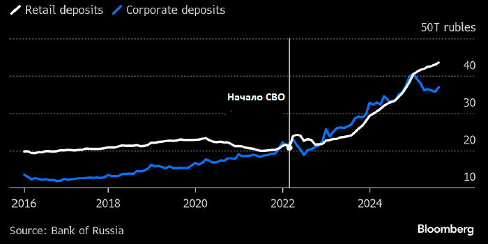 С момента начала СВО совокупная доходность срочных вкладов составила 43,6%, уступив лишь фондам денежного рынка (60,4%) и самым высококачественным корпоративным облигациям (50,6%). С начала текущего года вклады принесли 14%, пишет Bloomberg со ссылкой на данные ЦБ. Россия: белым — объем средств на банковских депозитах физлиц, голубым — юрлиц (трлн руб.). Данные: Банк России, источник: Bloomberg Российские домохозяйства накопили рекордный объем средств на банковских депозитах, пишет Bloomberg со ссылкой на опубликованный во вторник Банком России материал «О развитии банковского сектора российской федерации в июле 2025». Таким образом, россияне продолжают извлекать выгоду из высоких процентных ставок. За первые семь месяцев года физлица увеличили объем денег на депозитах на 8%, доведя его до 43,6 млрд руб. ($542 млрд), пишет Bloomberg со ссылкой на данные ЦБ. Совокупный показатель для срочных вкладов и текущих счетов достиг 61,1 трлн руб. Следует отметить, что приток средств физлиц в бан