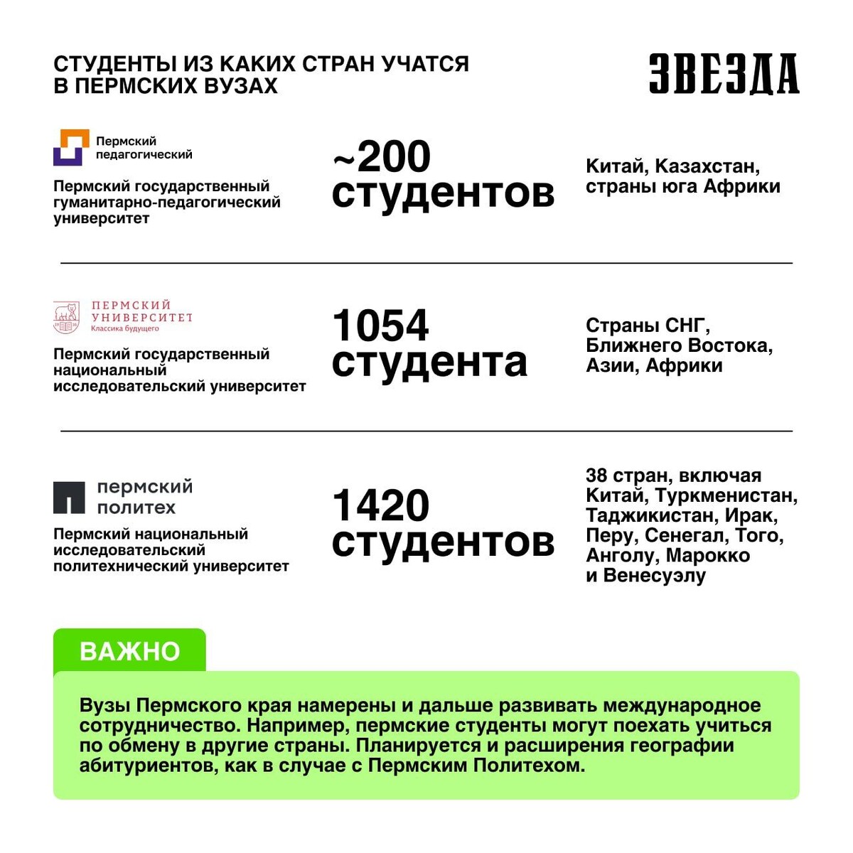 По состоянию на 22 августа в Пермском государственном национальном исследовательском университете (ПГНИУ) обучаются 1054 иностранца, в том числе из стран СНГ, Ближнего Востока, Азии и Африки. Средняя стоимость обучения для иностранных студентов составляет 300 000 рублей в год. Бюджетные места предоставляются в рамках квоты Правительства Российской Федерации. Студенты ПГНИУ могут участвовать в грантовых и стипендиальных программах обмена с указанными странами, что позволяет поступать в ведущие вузы мира. Университет активно развивает международное сотрудничество с 2017 года, рассказали в пресс-службе университета.
