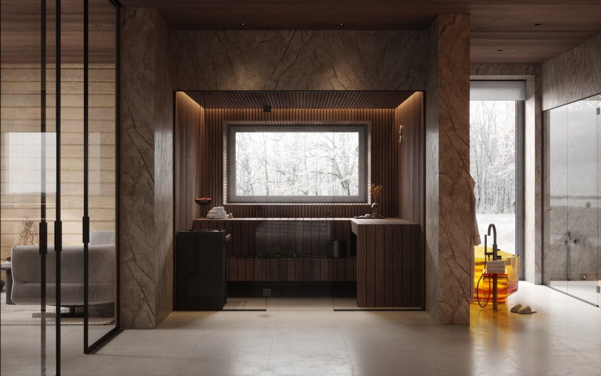 Сауна — это неотъемлемая часть любого spa-комплекса. Современные дизайнеры часто выбирают финскую сауну, оформленную в минималистичном стиле с использованием натурального дерева. Стеклянные элементы позволяют максимизировать доступ естественного света. Стекло визуально расширяет пространство и создает эффект легкости.