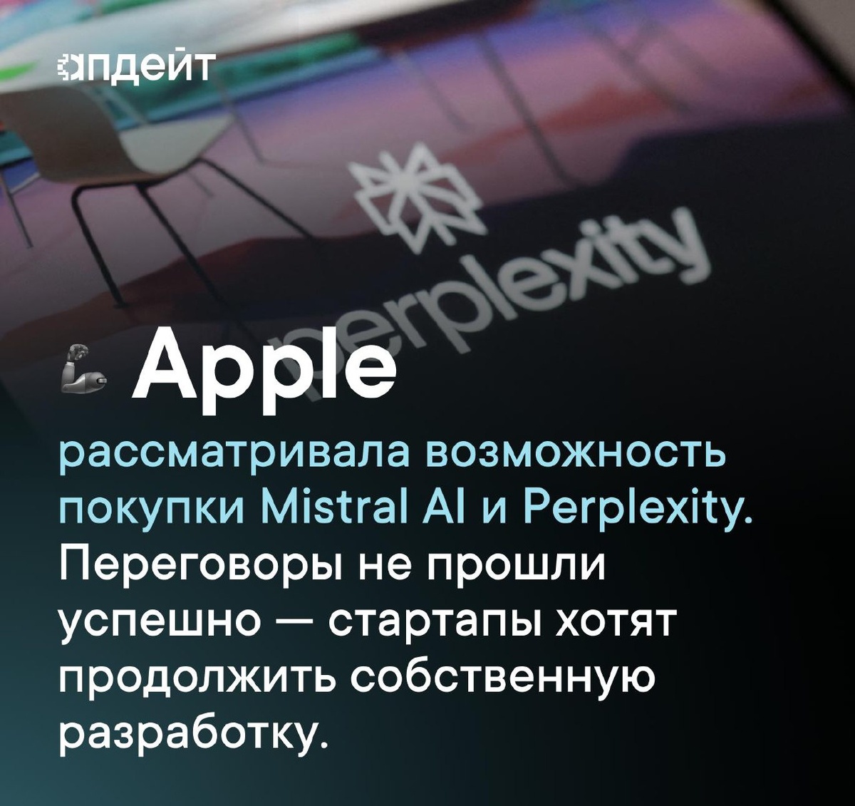 ☁️Apple хочет в ИИ Apple рассматривала покупку стартапов Mistral AI и Perplexity, чтобы ускорить развитие своих ИИ-решений. Переговоры не привели к сделке: часть руководства выступала за самостоятельную разработку. ⚡️ Подписаться.