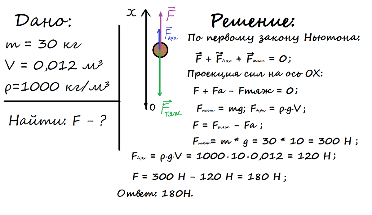 F = 300 Н - 120 Н = 180 Н - Анализ ответа: Сила 180 Н — это как поднять груз массой 18 кг. Это меньше, чем 30 кг. Логично, ведь вода помогает. Размерность — Ньютоны, все верно.