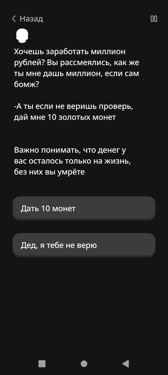 В этом первом посте хотелось бы рассказать кратко о том, что вообще это за программа и что такое текстовые квесты. Текстовые квесты-интерактивные истории, на сюжет которых вы можете напрямую влиять, у вас есть выбор того, как поступить в той или иной ситуации, а зависимости от этого история которую вы "проходите" может закончиться по разному. Конечно на словах это достаточно тяжело понять, проще увидеть: И так, как вы уже поняли каждый вариант развития истории прописывает автор квеста. В сегменте ПК программ для создания квестов хоть отбавляй, на любой вкус и цвет, однако если вы попытаетесь найти программу на Android вы будете разочарованы. Достойных программ мало, а то и вовсе нет. Конечно всё зависит от личных предпочтений, но моё мнение в этом вопросе склоняется к тому, что удобной программы для создания текстовых квестов на андроид нет(в формате конструктора, я знаю про Instead). Я долгое время ждал когда же кто-нибудь создаст такую программу, на подобии Twine, вот скриншот из