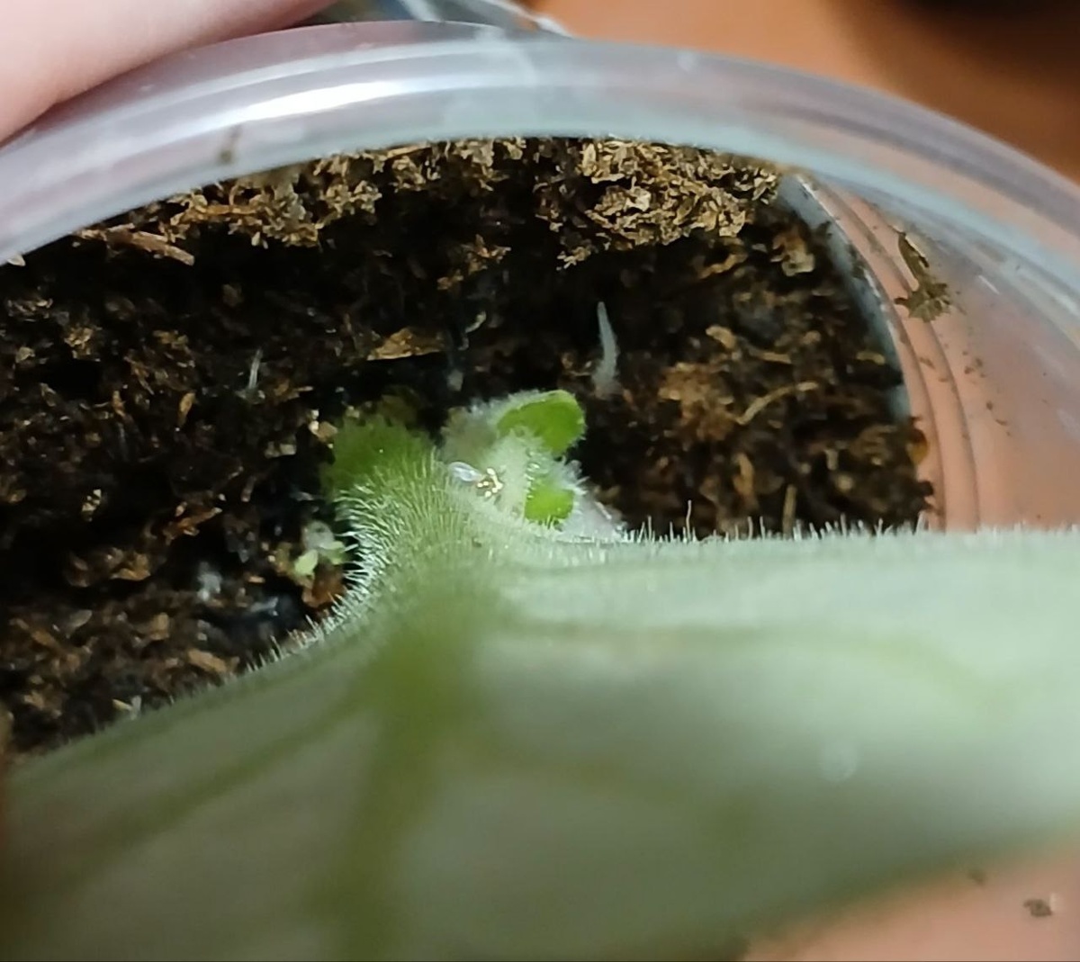 Недавно в очередной раз рассаживала деток и увидела два листика, которые были посажены в один стаканчик 50 мл. Я решила, что эксперименты над фиалками я ставить не буду и лучше листья рассадить (иначе их будущим деткам было бы очень тесно) 🌱🌱🌱🌱🌱🌱🌱🌱🌱🌱🌱🌱🌱🌱🌱🌱 Объясняюсь, почему так произошло🫣При поливе от одной розетки случайно отломался лист. Лист был хороший и выкидывать жалко я вспомнила, что розеток этого сорта у меня маловато. Но сажать специально лист я не стала, поэтому он был воткнут в ближайший стаканчик с землёй. В нем до этого укоренялся другой лист, но приказал долго жить (вообще лучше не укоренять лист в той земле, в которой до этого почил другой, но опустим этот момент🤭) Через какое-то время ситуация повторилась, причём с тем же сортом. И на этот раз лист был воткнут к первому листу в тот же стаканчик😆 🌱🌱🌱🌱🌱🌱🌱🌱🌱🌱🌱🌱🌱🌱🌱🌱 Возвращаемся к моменту рассадки листьев. Один лист был "посажен" относительно недавно, поэтому даже не успел нарастить кор