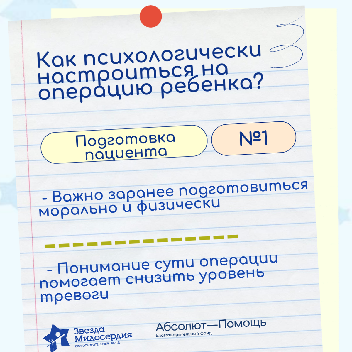 На прошлой неделе мы рассказывали, что необходимо сделать перед госпитализацией ребенка на операцию. Сегодня же мы затронем не менее важную тему: как психологически настроиться на операцию. Отметим, что этот полезный материал подготовлен с использованием пожертвования Благотворительного фонда «Абсолют-Помощь». Каждому человеку в этом случае безусловно важна поддержка близких и понимание сути хирургического лечения. На какие моменты советует обратить внимание нейропсихолог фонда и гештальт терапевт «Тоша и Ко» Любовь Кяргинская мы собрали в карточках. Отметим, что тезисы мы взяли из видео «Как психологически настроиться на операцию?», размещенном на нашем портале «Путь к улыбке». Посмотреть его полностью можно по ссылке.
