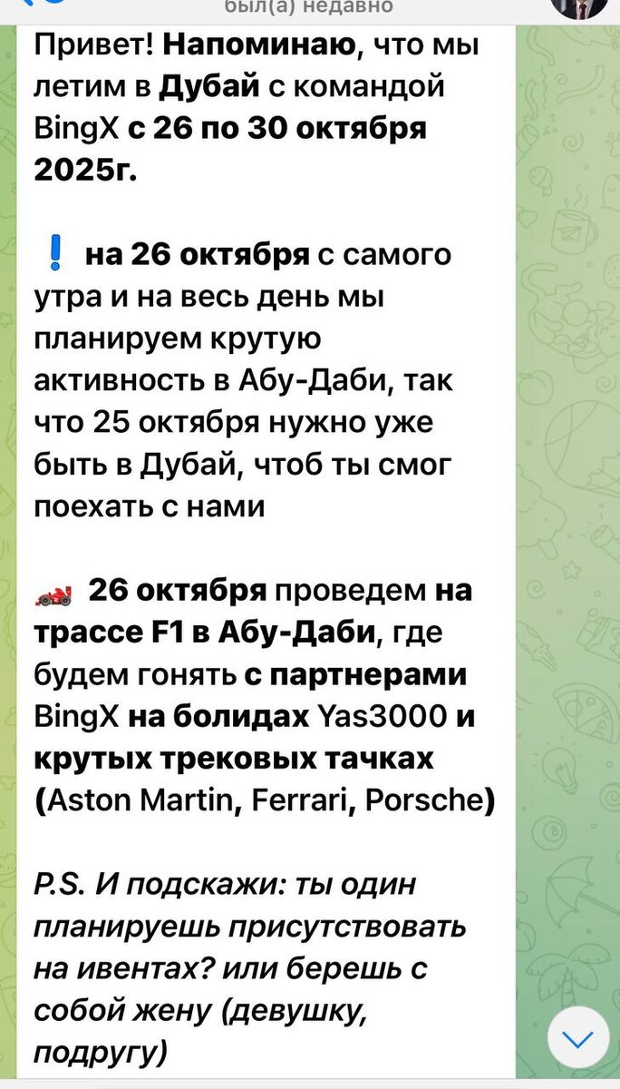 🥲 Когда я получил это сообщение сначала обрадовался… Пока не дочитал до последнего абзаца. Беру ли я с собой жену? Черт, да у меня даже девушки нет и свободных подруг! С деньгами у меня никогда не было проблем из-за финансовой грамотности, я впитал её с самого детства. А вот с отношениями, признаюсь вам, как-то вообще не складывается. Возможно, у меня действительно слишком высокие требования к партнеру раз я хочу добрую, адекватную девушку без сломанной психики от прошлых отношений… которая имеет свое мнение на разные темы, любит читать книги, которая имеет хоть какие-то стремления в жизни или сможет поддержать мои, которая не живет в матрице бесконечного потребления и понимает чего реально хочет, следит за собой, не боится серьезных отношений и имеет загранпаспорт, чтобы мы могли вместе путешествовать по миру 🌍 Неужели я много прошу, Вселенная? Неужели таких девушек не существует?! Каждый день я отправляю тебе запрос в космос на самых высоких вибрациях и каждый день не получаю о