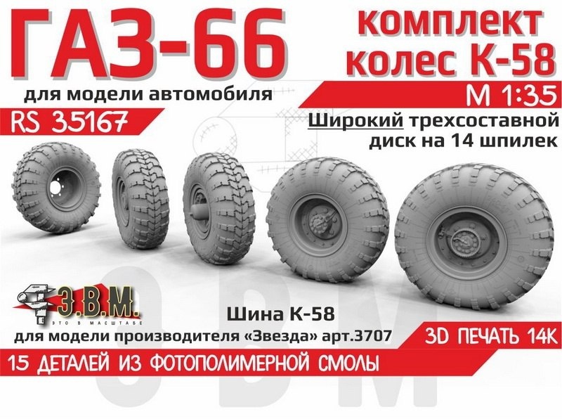 Э.В.М. из Севастополя выпустила на 3D-принтере набор колес с шинами К-58 на широком трехсоставном диске на 14 шпилек для моделей ГАЗ-66 в масштабе 1/35: Колеса для Газ-66 с шиной К-58 на широком, трехсоставном диске на 14 шпилек (каталожный номер RS35167)