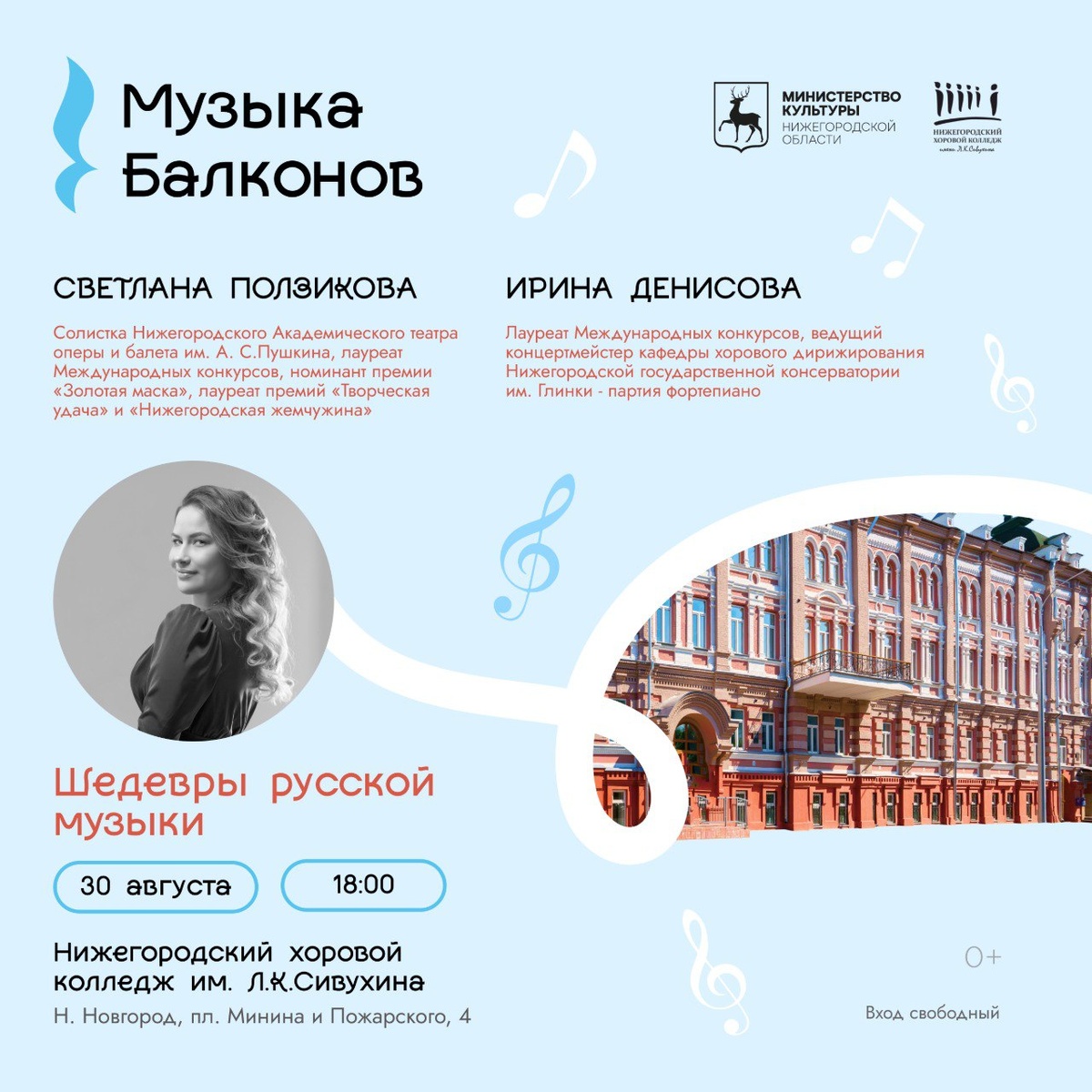 Фестиваль «Музыка балконов» 📌 30 августа в 18:00 Нижегородский хоровой колледж имени Л.К. Сивухина (Н. Новгород, пл. Минина и Пожарского, д. 4) На балконе хорового колледжа выступит солистка Нижегородского театра оперы и балета имени А.С. Пушкина, лауреат международных конкурсов, а также номинант «Золотой маски» и лауреат премий «Творческая удача» и «Нижегородская жемчужина» Светлана Ползикова. Партию фортепиано исполнит ведущий концертмейстер кафедры хорового дирижирования Нижегородской консерватории имени М.И. Глинки Ирина Денисова. В программе «Шедевры русской музыки» прозвучат произведения на стихи Александра Пушкина, Алексея Толстого и других авторов, положенные на музыку Петра Чайковского, Николая Римского-Корсакова, Сергея Рахманинова, Милия Балакирева. Например, вы услышите популярные романсы «Отцвели уж давно хризантемы в саду», «Побудь со мной» и «В лунном сиянии». 📌 31 августа в 18:00 Дом Сироткина (Н. Новгород, Верхневолжская наб., д. 3) Концерт коллектива «Нижегород