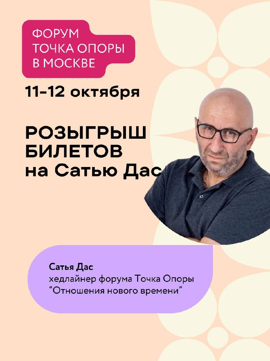 Разыгрываем 5 билетов на Сатью Дас! 11-12 октября пройдет уникальный форум «Точка опоры – отношения нового времени», и мы хотим подарить нашим подписчикам возможность быть частью этого события! Условия простые: 1️⃣ Быть подписанным на наш канал 2️⃣ Оставить любой комментарий под этим постом 🎁 Все участники розыгрыша получат промокод на 10% скидку! А 5 счастливчиков получат билеты на форум по тарифу Стандарт + ⭐️ ⏳ Итоги подведём 31 августа.