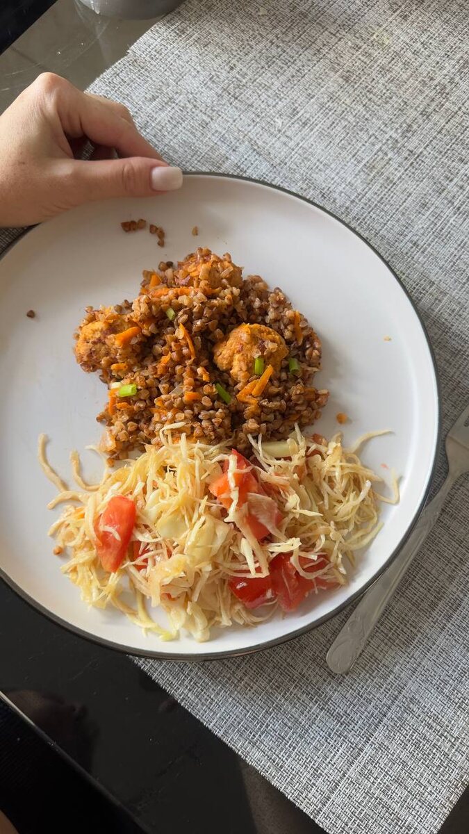 Ловите идею очень простого обеда, но очень полезного и сбалансированного! Готовим все в одной емкости. Трудозатраты 15 минут! 🔸обжарить 300 гр куриных тефтель, либо куриное филе 🔸добавить лук/морковь/специи (соль,перец,прованские травы, паприка, чеснок) 🔸2 стакана гречки 🔸3 стакана воды и 1 ст ложка томатной пасты 🔸накрываем крышкой и забываем на 30 мин (хотя не, переодически смотрите воду. Если прям выпарилась, подливаем) Усё готово! Любой свежий салатик и у вас обед ПП.