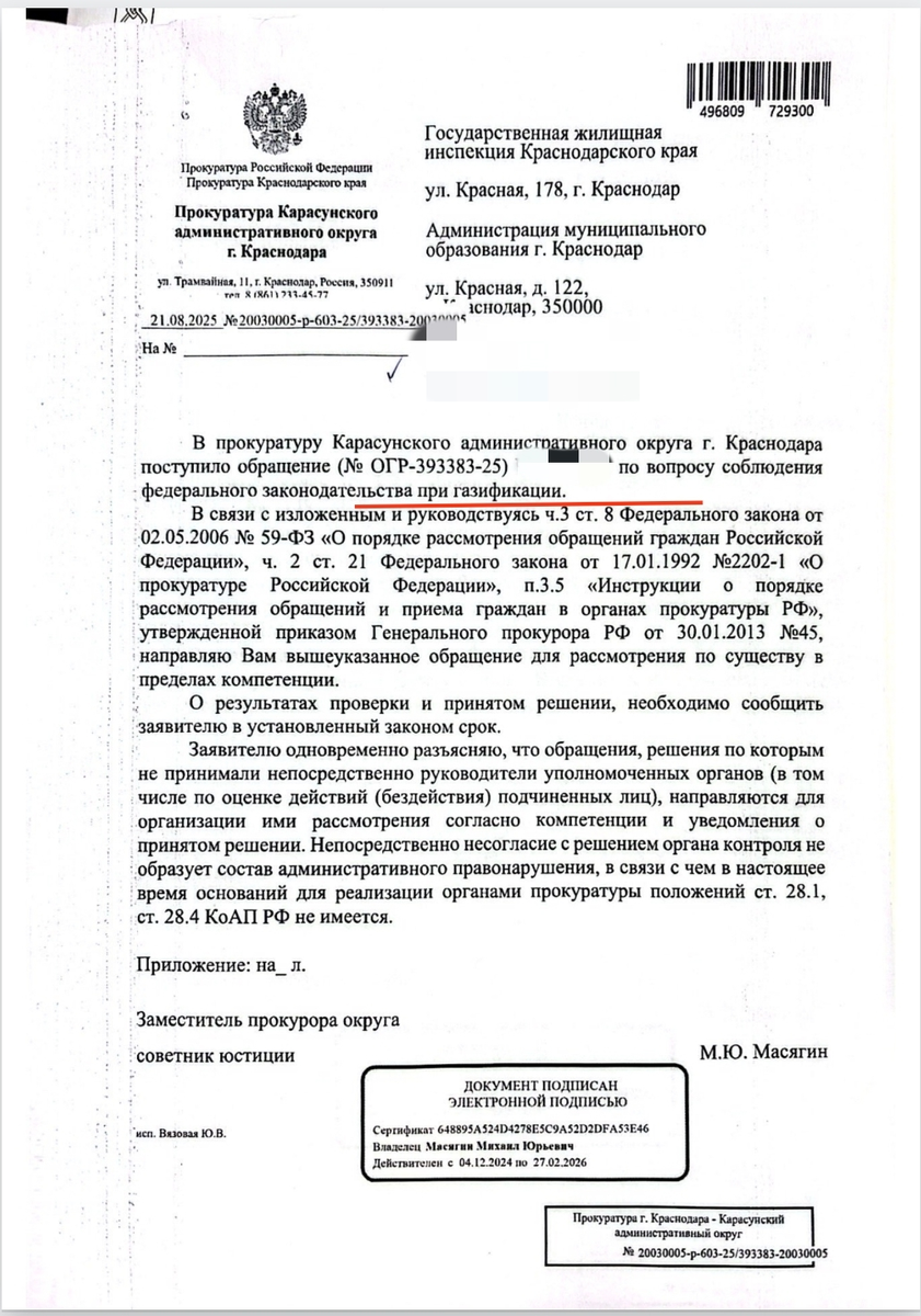 Подача обращения в органы прокуратуры № 6018022432. Заявление отправлено в ведомство. Сегодня в 16:11 Генеральному прокурору Российской Федерации ЗАЯВЛЕНИЕ об установлении достоверных фактов по поводу несанкционированного обращения Уважаемый Игорь Викторович! 27 августа 2025 года я на свой адрес электронной почты получил ответ от заместителя прокурора Карасунского административного округа г. Краснодара советника юстиции М.Ю. Масягина. Из данного документа (исх. № 20030005-p-603-25/393383-20030005 от 21.08.2025) следует, что в прокуратуру Карасунского округа поступило обращение за № ОГР-393383-25, которое якобы исходит от меня и касается вопроса «соблюдения федерального законодательства при газификации»(!). Уважаемый Игорь Викторович, я хочу официально и категорично заявить, что я никогда не обращался в прокуратуру Карасунского административного округа г. Краснодара с какими-либо вопросами, связанными с газификацией. У меня нет ни дачи, ни иного объекта в Краснодаре, а в моей квартире г