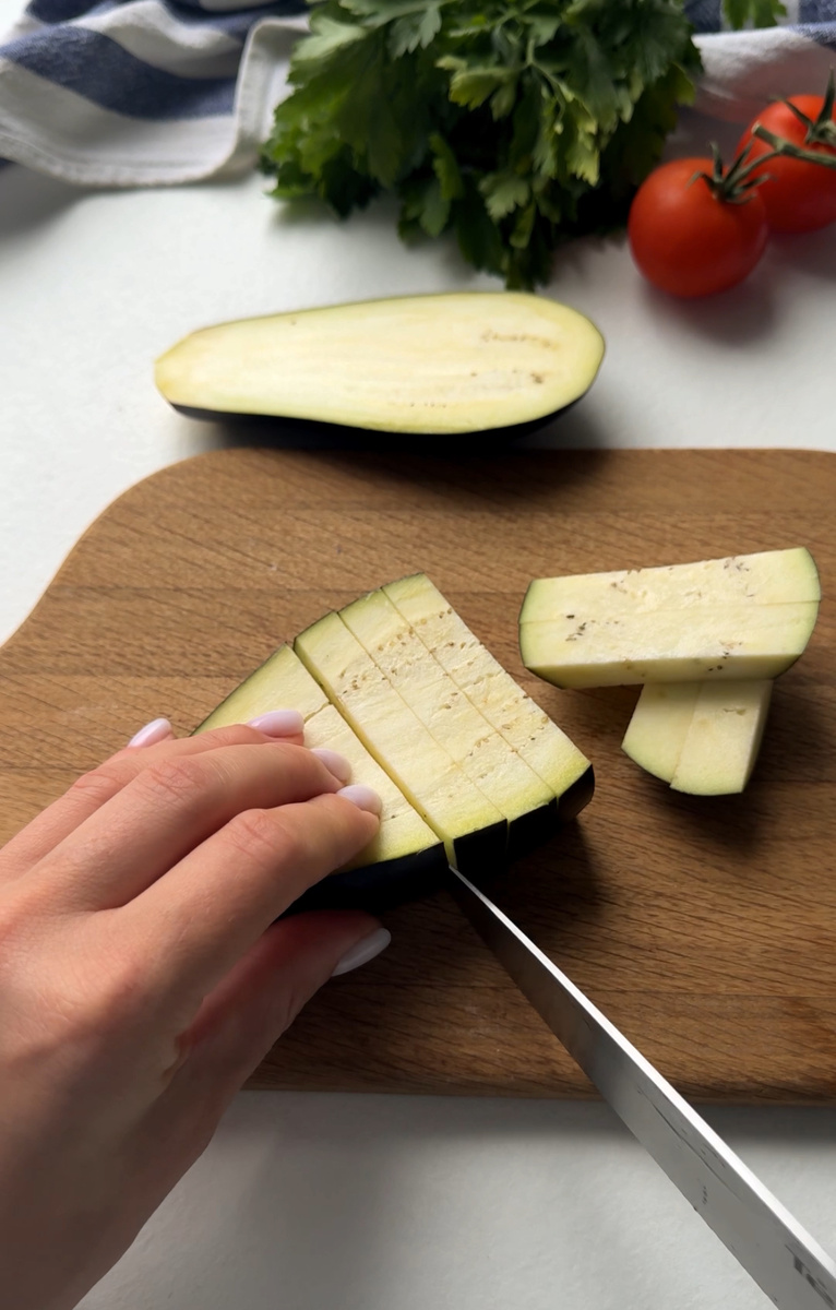 А вот семья осталась в дичайшем восторге! Никто так и не угадал, что это баклажана, но уплетали со скоростью света, поэтому если решите это приготовить, готовьте сразу тройную порцию) Ингредиенты: •средний баклажан Панировка: •150-200 гр муки •соль, перец, сухой чеснок по вкусу •70 -100 гр сыра •чайная ложки оливкового масла •вода Баклажан нарезаем на ломтики, посыпаем солью и оставляем на 5-7 минут, затем промываем и хорошо высушиваем. Делаем кляр, смешиваем муку, специи, сыр натертый и масло, начинаем перемешивать и вливаем воду понемногу, следим за консистенцией, она должна твит как очень густая Сметана. Окунаем каждый ломтик баклажана и выкладываем на пергамент. Выпекаем при температуре 190 градусов 20-25 если в духовке, в аэрогриле 190-200 градусов 10-15 минут, до золотисто-коричневого цвета. Получается просто вау! Обязательно готовьте, и оценивайте рецепт от 0 до 3 😄❤️