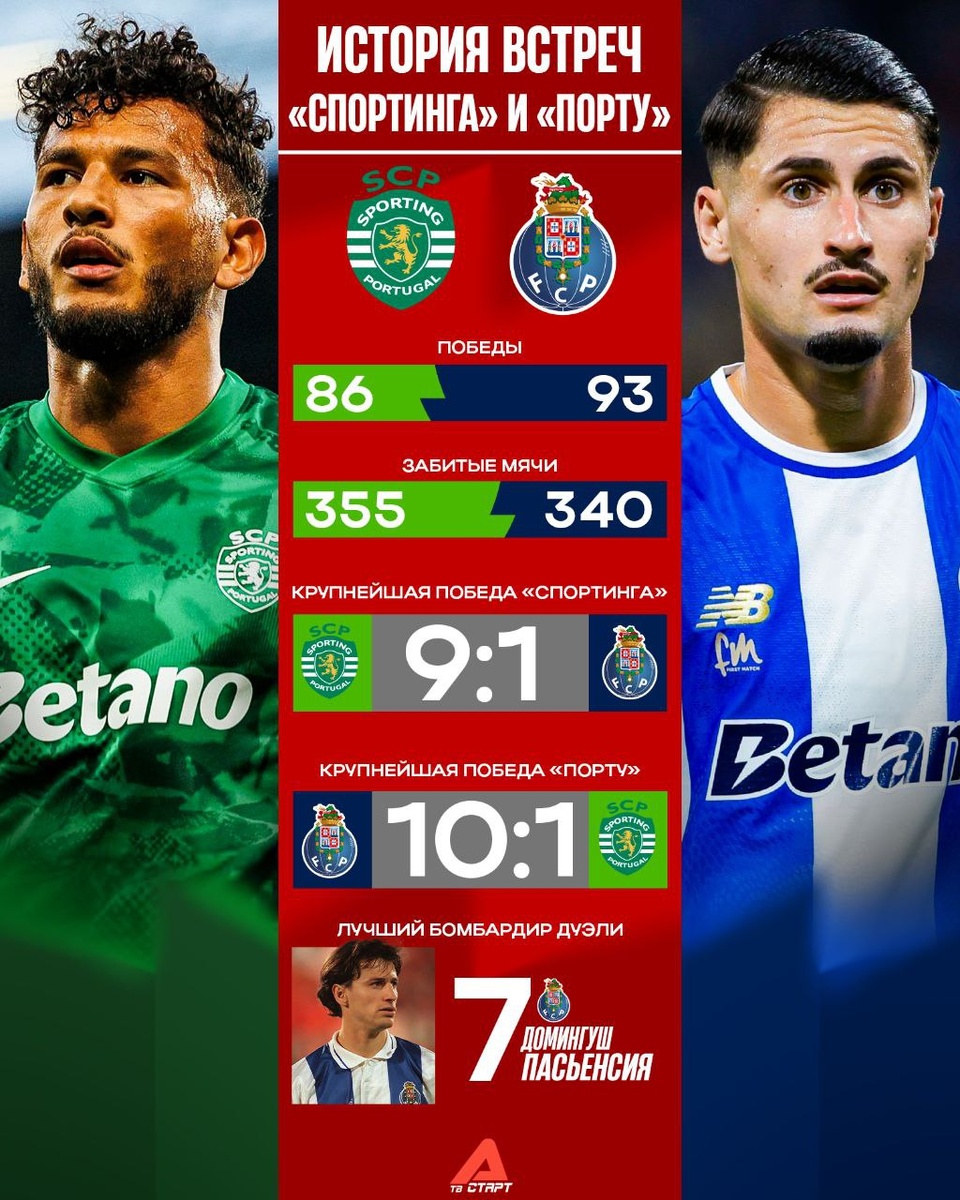 ⚔🔎 «Спортинг» vs «Порту»: сравниваем соперников перед очной встречей Больше всего удивляет графа «крупные победы». В тридцатые годы прошлого века «львы» и «драконы» друг с другом не церемонились. Лучшим бомбардиром этой дуэли остаётся Домингуш Пасиенсия, который провел в футболке «Порту» 12 сезонов. Увидим, что подарит нам новая глава противостояния в субботу в 22:00 на платформе TVSTART.RU 🖥 🛒 Наше приложение в Google Play 💙 Наше приложение в RuStore 🛒 Наше приложение в App Store