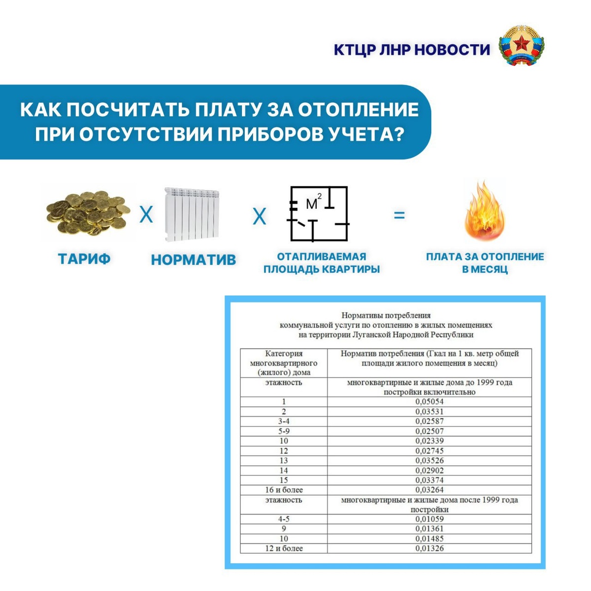 💸Сколько теперь платить за отопление ❗️Расчет платы за коммунальную услугу по отоплению регулируется Правилами предоставления коммунальных услуг, утвержденными постановлением Правительства РФ от 06 мая 2011 г. № 354 ⭕️Важно понимать, что плата за отопление, при отсутствии общедомового счетчика, рассчитывается по нормативу и взимается только в течение отопительного сезона! ➡️Чтобы убедиться, что ваша платежка верная, воспользуйтесь простой формулой: Плата за отопление в месяц = Площадь квартиры × Норматив потребления × Тариф на тепловую энергию ⚪️В предстоящем отопительном периоде 2025-2026 гг тариф на тепло для населения составляет 2157,72 руб./Гкал, согласно постановлению Комитета тарифного и ценового регулирования ЛНР от 21 августа 2025 г. № 18/1. ☝️Размер норматива потребления зависит от этажности дома и дома его постройки, согласно постановлению Комитета тарифного и ценового регулирования ЛНР от 01 ноября 2024 г. № 7/2. Источник: Комитет тарифного и ценового регулирования