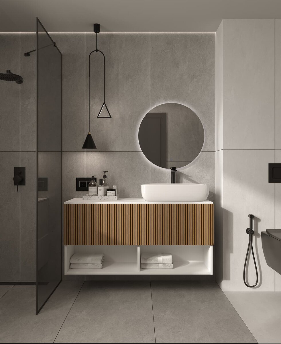 Выбирайте мебель из влагостойкого МДФ (обязательно с защитной кромкой по всем торцам!) или массива дерева с специальной пропиткой. Идеальный вариант для современного санузла — металл (алюминий) и закаленное стекло. Они не боятся воды и выглядят стильно. Важно: Проверьте класс влагостойкости. Маркировка E1 — минимальная защита, для ванной нужно не ниже E0 или влагостойкий МДФ (HMR). Что происходит?