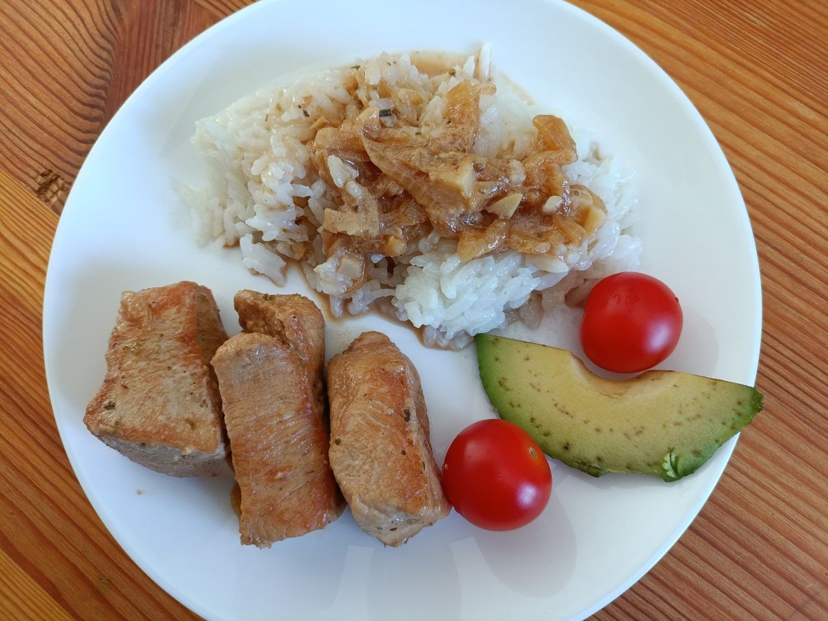 Индейка, тушëная в луково-сметанно-соевом соусе. По рецепту сначала индейка обжаривается, потом обжаривается лук, добавляется сметана с соевым соусом и индейка тушится в соусе. Добавить чеснок. Но она получилась суховатой, поэтому в следующий раз тушить не будем. Достаточно просто обжарить. Но всё равно очень вкусно! #мамкинповар