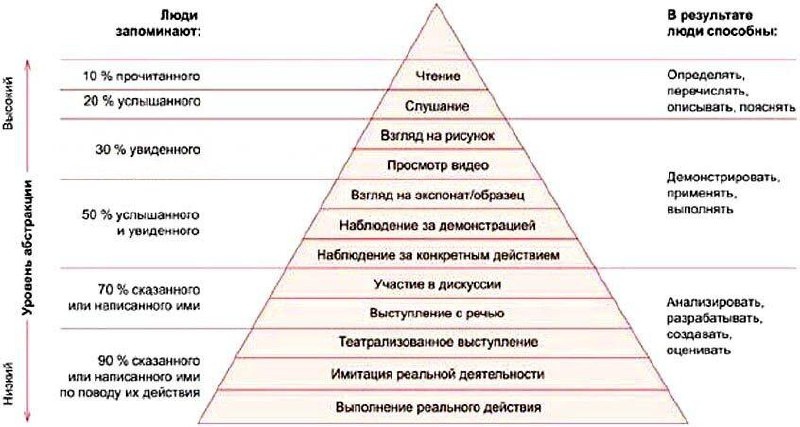 Конус обучения Эдгара Дейла Та самая картинка, которую любят показывать на всевозможных тренингах: «чтение - 10%, практика - 90%», но это миф! Cам Дейл не включил цифры и не основывал свой конус на научных исследованиях, и он также предупреждал читателей не воспринимать конус слишком серьезно. Цифры появились в 1967 году, когда сотрудник Mobil, Д.Г. Трейхлер, опубликовал статью в Film and Audio-Visual Communications, и с тех пор миф начал жить своей жизнью. Тем не менее, современные исследования подтверждают: практика, обсуждения и обучение других реально работают эффективнее пассивного чтения, лекций или видеоуроков. По итогу: не гонись за красивыми схемами, просто учись через действие, ведь принцип «делай, а не просто читай» работает всегда и везде. #Продуктивность@maxchudov
