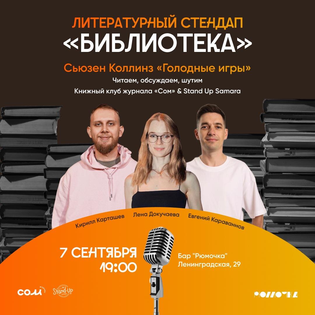 Литературный стендап «Библиотека»: Сьюзен Коллинз «Голодные игры» Мы соскучились! И наконец-то встречаемся первым осенним воскресеньем, чтобы обсудить одну из самых культовых книг начала 2000-х — «Голодные игры» 🐦🔥 Ведущие – самарские стендап-комики Кирилл Карташев и Евгений Караваннов и, традиционно, Лена Докучаева — литературовед и главред журнала «Сом». Лена отвечает за историко-литературное сопровождение вечера, а парни — за смех и улыбки гостей. Читаем, обсуждаем и шутим 7 сентября в 19:00 в баре «Рюмочка». ⏩Билеты — 400 рублей. Гарантируем: даже те, кто не читал, получат удовольствие от вечера 📖 И пусть удача всегда будет с вами! #сом_книжный