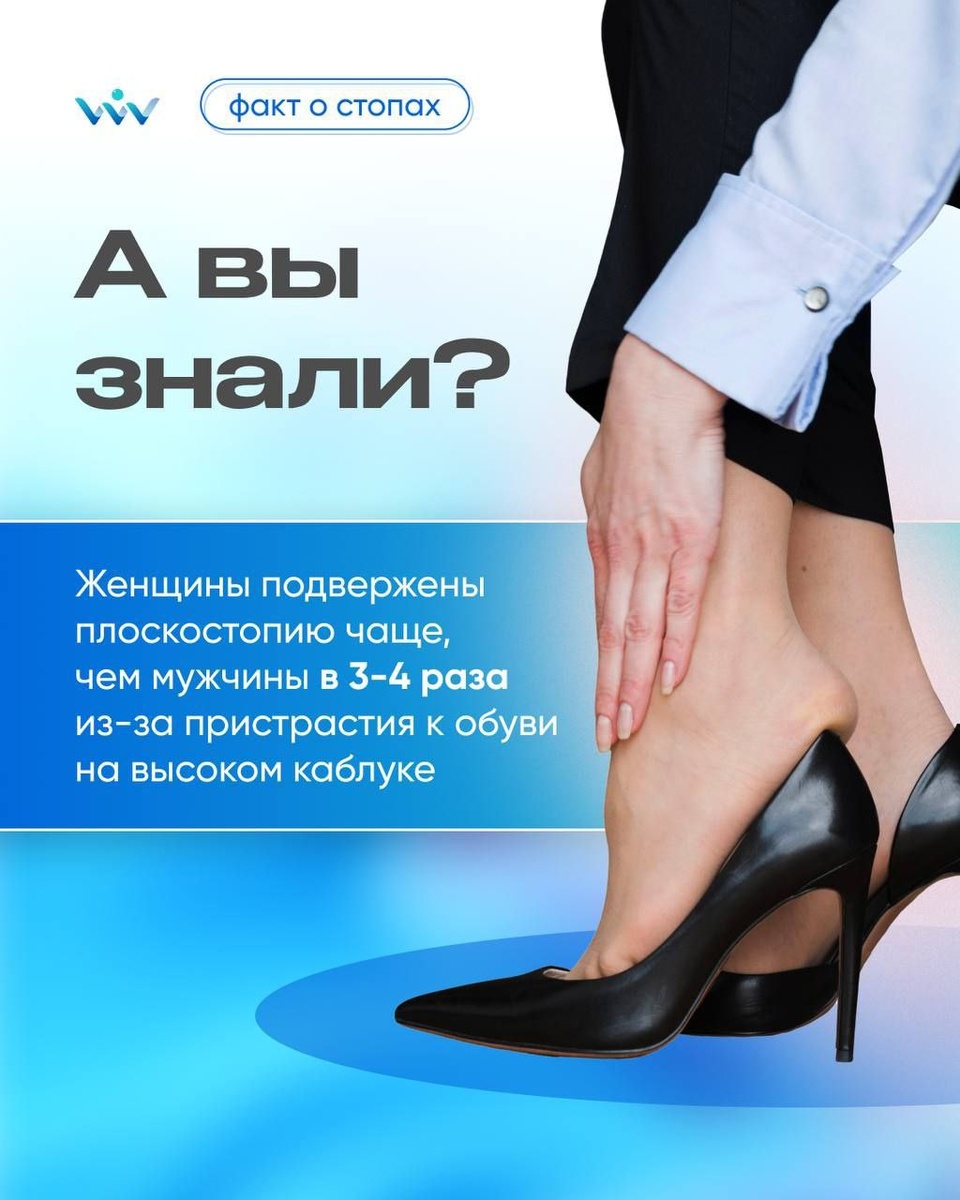Интересный факт: Плоскостопие чаще встречается у женщин! Почему? Согласно статистике, женщины в 3-4 раза более склонны к развитию плоскостопия, чем мужчины. Основная причина – пристрастие к обуви на высоком каблуке, которая негативно влияет на Но также на это влияют не только каблуки, но и ряд факторов, способствующих развитию плоскостопия у женщин: • гормональные изменения (например беременность) • анатомические особенности (у женщин более гибкие связки) • длительное ношение неудобной обуви, а не только с каблуками как таковыми • малоподвижный образ жизни и лишний вес Два последних фактора относятся к обоим полам