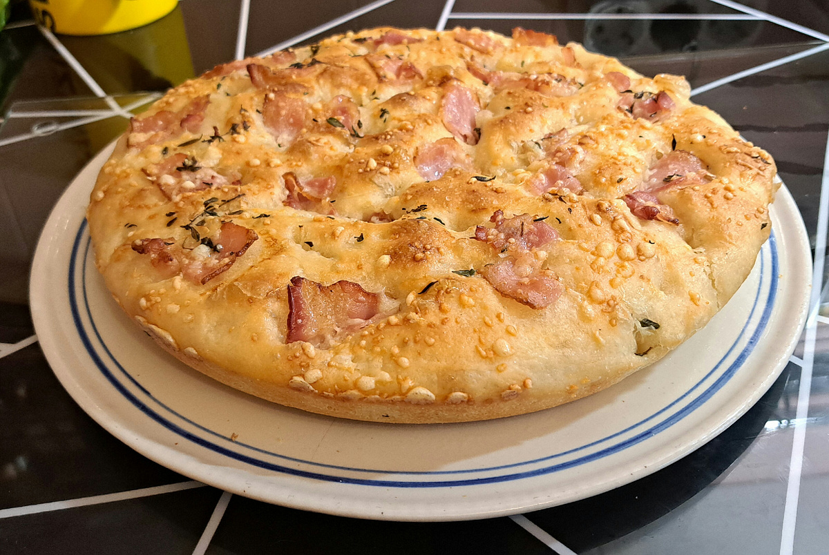 Это дрожжевой итальянский хлеб. Приготовление очень простое, не нужно даже скалку использовать. В каждом регионе Италии трансформируется внешний вид - начинка и форма (круг или квадрат). Начнем с круглой, ее проще растягивать руками. Для эмульсии: 50 мл воды 50 мл оливкового масла Все, кроме эмульсии я закладываю в хлебопечку и ставлю режим тесто (1,5ч). Всё! Вынимаем, на раскаточный коврик выливаем 1 ст л масла, выкладываем тесто, складываем пополам, приминаем, снова пополам, приминаем (не давим, аккуратно, чтобы пузырьки не лопнули), третий раз складываем, слегка вытягивая. Формируем шар. форму смазываем маслом, распределяем пальцами тесто по форме, аккуратно, не растягивая, ставим на 40 минут в духовку, чтобы тесто подошло. Смешиваем воду и масло венчиком до эмульсии. Через 40 минут подошедшую фокаччу вынимаем, 3-мя пальцами в 2 руки делаем углубления по всей фокачче, а затем обильно смазываем ее эмульсией и посыпаем крупной солью. Сверху можно посыпать розмарином, крошкой пармезана
