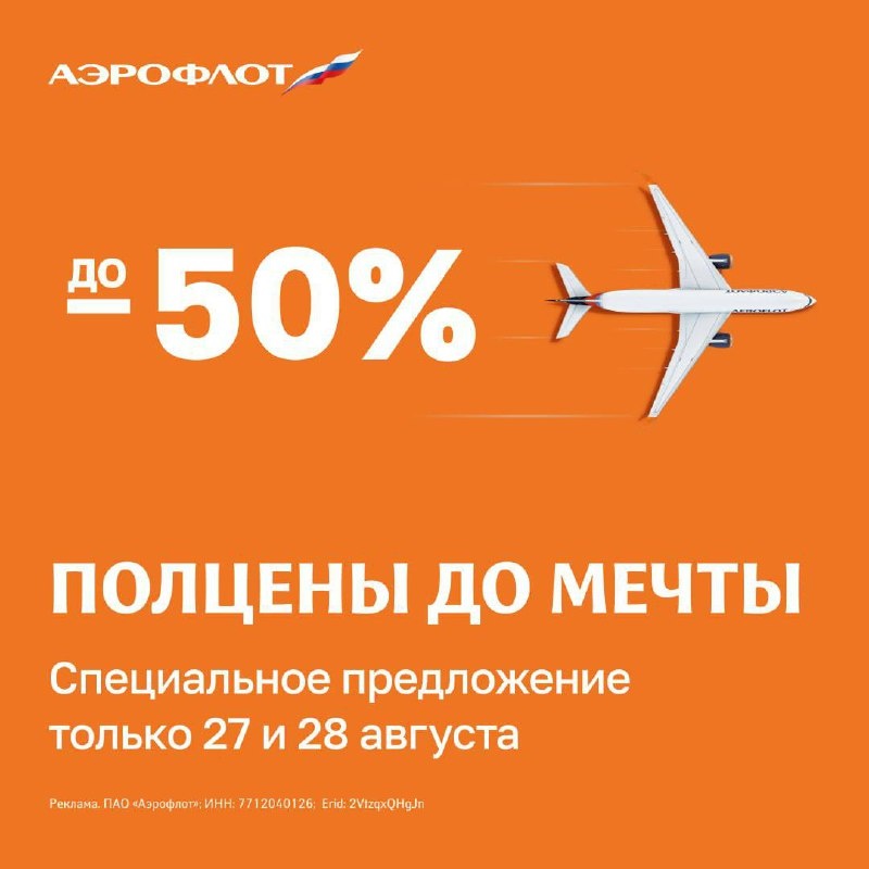 ⚡️ Всего два дня, чтобы забронировать билеты с выгодой до 50% Только 27 и 28 августа действуют специальные условия на перелёты туда-обратно по России и за рубеж по тарифу «Лайт». Вылеты до 30 сентября включительно. Успейте воспользоваться предложением на aeroflot.ru 💙