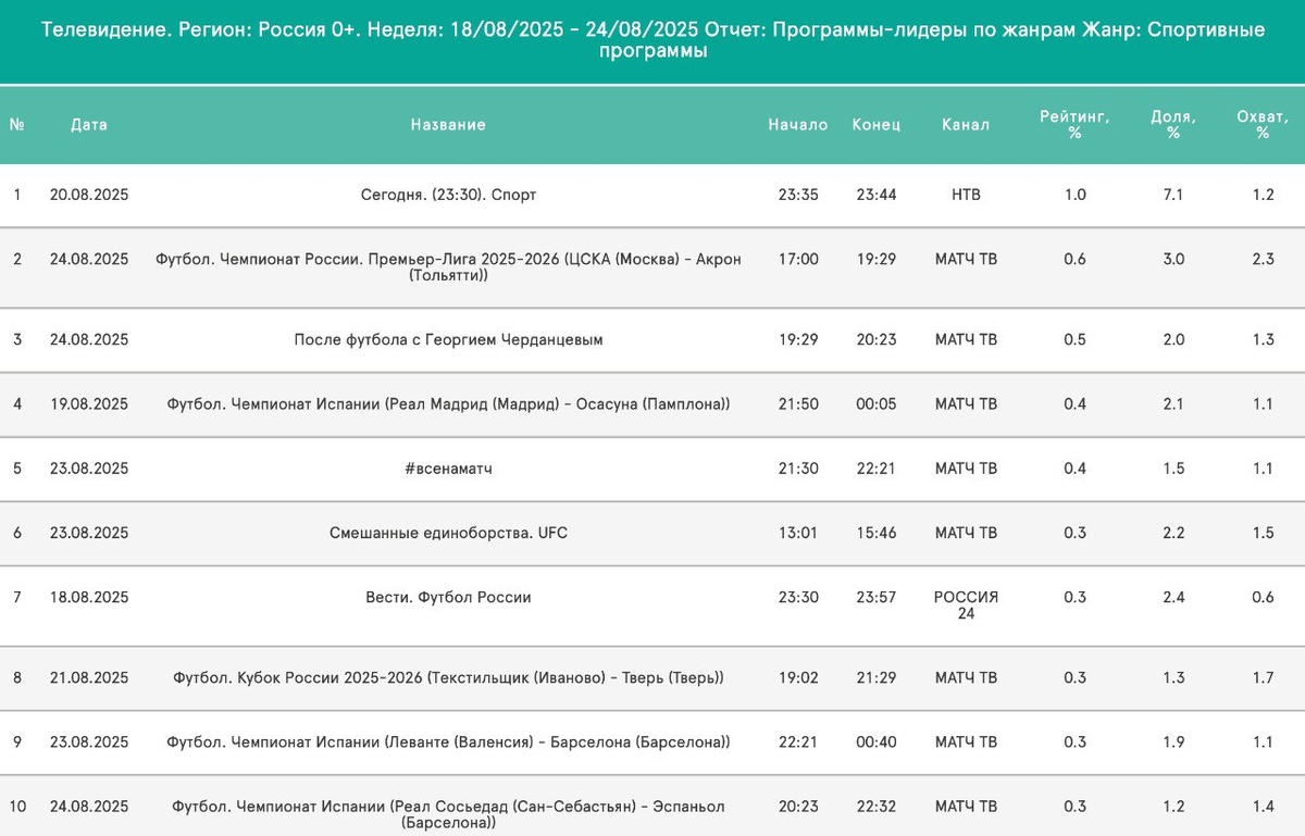 «ЧТО ПО ТЕЛИКУ»? Итоги спортивного смотрения 18.08-24.08, Россия, 4+ (137 388 938 чел.) 🗣 Как мы и отмечали в прошлом обзоре - "Матч ТВ" осознанно наступил себе на... трансляции, показав лишь 1 игру РПЛ. Она и заняла первое место на неделе. Правда, рейтинг получился низким даже по меркам нынешнего времени. Матчи с показателями в 0.3-0.4 обсуждать смысла нет; 🗣 Эта неделя - кубковая: аж 6 трансляций этого турнира по общедоступному каналу. А в выходные "Матч" покажет "Спартак" с "Сочи" (сб, 18:30), ЦСКА с "Краснодаром" (вс, 18:00), но уберёт на платник свой любимый "Зенит". Как говорится: "ни-че-го себе, ничего себе!" Топ 25/26: 1.1🥇- 🔴:🔵| ⚽️ 1.0🥇- ❤️:❤️| ⚽️ 1.0🥇- ❤️:🔵| ⚽️ 0.9🌟 - 🏒 | ТМ 0.9🥇 - 🔵:🟡| ⚽️ 0.9🥇 - 🏊♂ | ЧМ 0.9🥇 - 🟢:🔵| ⚽️ 0.8🥇 - 🔴:🔵| ⚽️ 0.8🥇 - 🏊♂ | ЧМ 0.8🥇 - 🔵:❤️| ⚽️ 0.8🥇 - ❤️:🔴| ⚽️ 0.8🥇 - 🔵:❤️| ⚽️ Игры ❤️ на 🥇: ⚽️ 4 из 7 🏆 2 из 3 0.3 - ❤️:🇷🇸 13.07.25 | ТМ 0.8 - 🔴:🔵 19.07.25 | ⚽️ 0.8 - ❤️:🔴 09.08.25 | ⚽️ 0.7 - 🔴:🔵 12.08.25 | 🏆 1.1 -