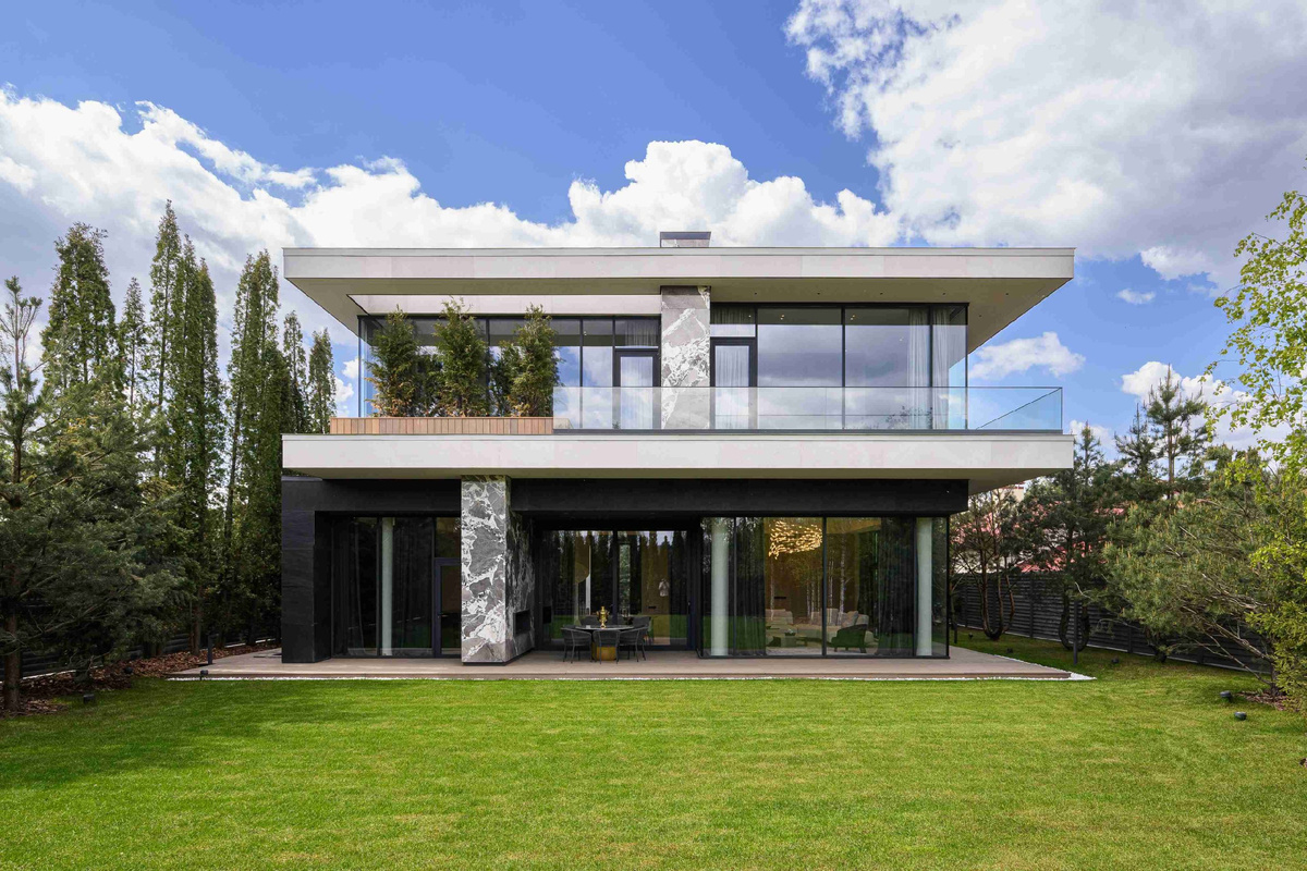 В архитектуре дома решили отойти от минимализма бизнес-класса и создать фасад премиального уровня. Для отделки использовали натуральные материалы: кварцит стоимостью более 500 долларов за квадратный метр, который прочнее гранита в пять раз; бразильский сланец в большом формате; мраморизованный известняк самого светлого оттенка без желтизны, чтобы создать южный, благородный экстерьер.