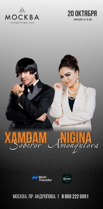 Купить билеты Xamdam Sobirov / Nigina Amonkulova / Москва / 20.10 понедельник 20 октября, 19:00 КЗ Москва 20 октября в Москве состоится концерт Хамдама Собирова и Нигины Амонкуловой ,при поддержке генерального спонсора- ПС MultiTransfer! Выступление пройдет на сцене концертного зала "Москва", где зрители смогут насладиться яркими хитами, завоевавшими вершины музыкальных чартов и покорившими сердца миллионов слушателей по всему миру. Не упустите уникальную возможность! Для связи: 88002220091 Место проведения концерта: Концертный зал "Москва", г. Москва, пр-кт Андропова, д. 1.
