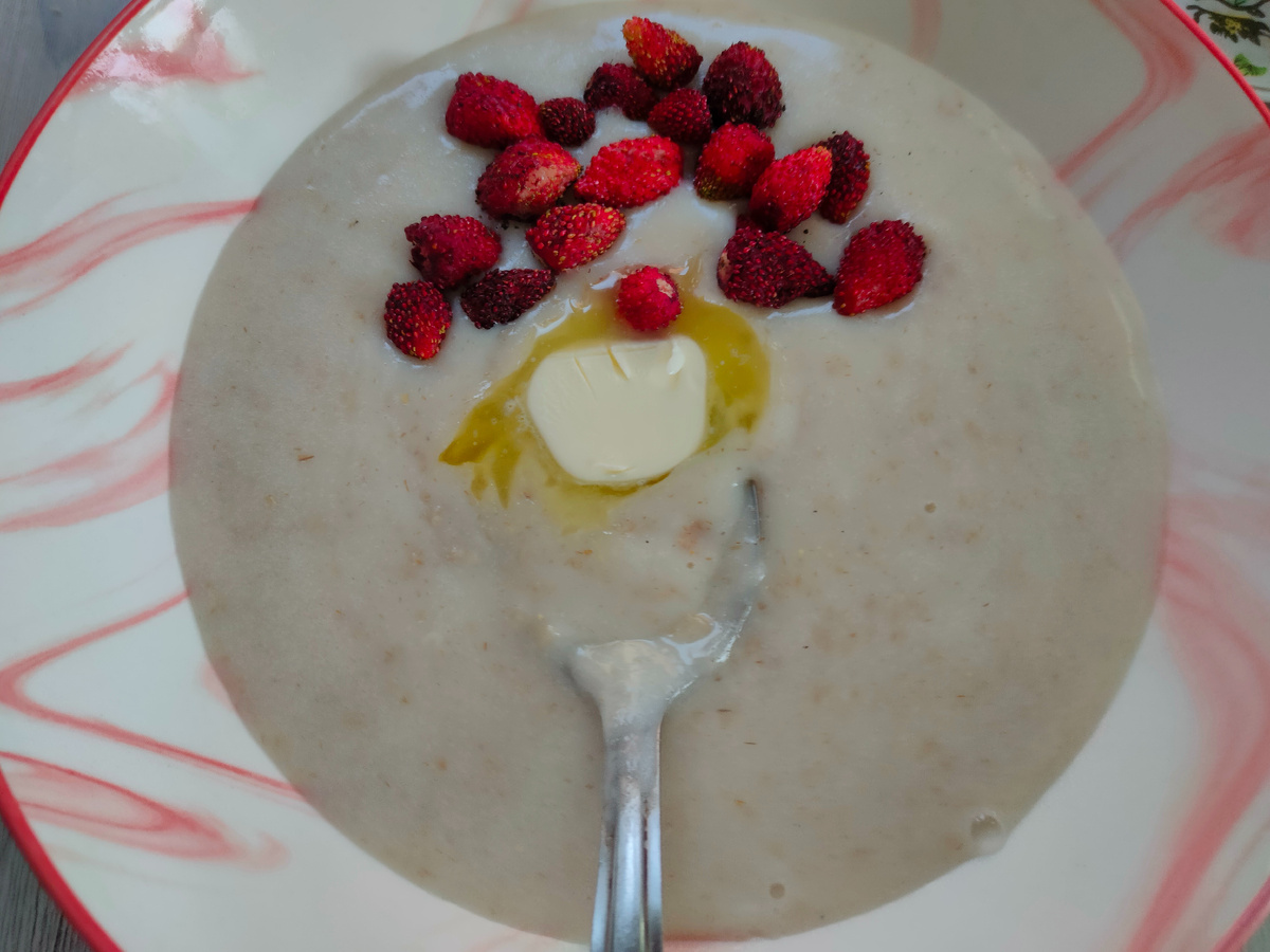 Завтрак: овсяная каша на молоке с сахаром и сливочным маслом + садовая земляника. Я ее еще вчера собрала, но не всю использовала. Достала из холодильника, аромат стоит на всю кухню.
