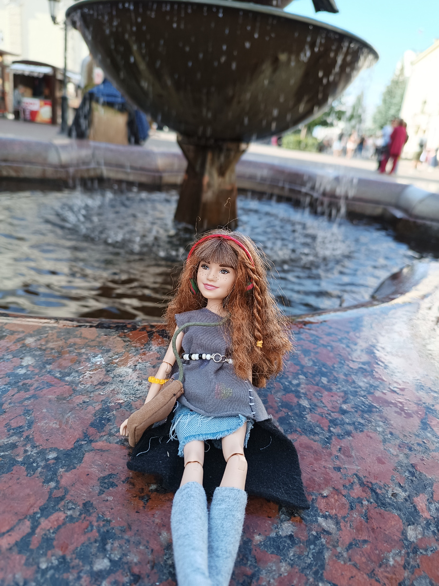 Всем привет! Эти фото ждали почти месяц. Хотя это был самый гармоничный образ у моих кукол. Началось всё неожиданно.... С наушников. Изготовлены из глины и бутылочного колечка. Добавила украшений и стало похоже на человеческие. К ним я добавила сложенную пополам юбку взрослой куклы, футболку сшитую для баболей, родные гольфы, и украшения... А также накидка ставшая черной полу-юбкой. Вообще вначале я думала по фотографировать Гермиону в городе. Попробовать. Гуляли с подругами. В итоге один раз щёлкнула и убрала в сумку. Это самая оживлённая улица Казани - Баумана. Рядом находится моя школа. Надо было как-то всё таки Гермиону по фоткать. Фоном стала бетонная лесенка перед домом. Забавно что в этот раз любезные Крузики (куклы Крузелингс) одолжили нам только обувь и сумку. На одну руку я надела бусину как браслет ( причем довольно варварским способом - вынула руку, надела, воткнула руку). А на другую просто широкую резинку. Стало похоже на перчатку. На юбку для интереса добавила пару