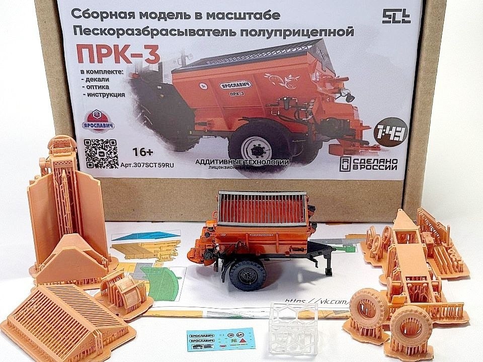 Пермская SCT (Масштабные модели спецтехники) выпускает на 3D-принтере доработанную модель полуприцепного пескоразбрасывателя ПРК-3 производства АО "ПК"ЯРОСЛАВИЧ" в масштабах 1/43, 1/35 и 1/32 (на фотографиях модель в масштабе 1/43).