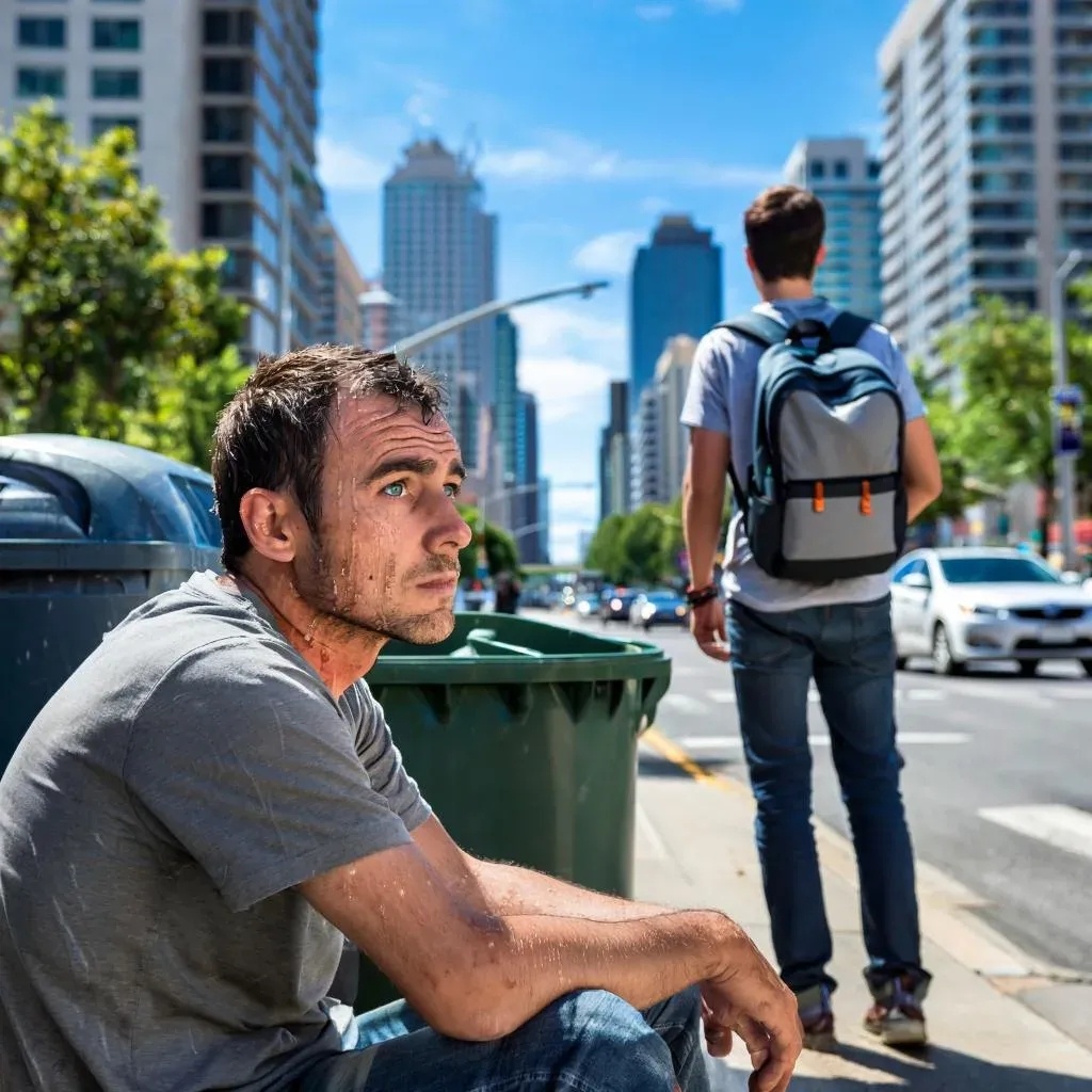 Что-то во мне ёкнуло — жалость, любопытство, может, просто молодёжная порывистость. Я подошёл ближе. Скрип гравия под ногами заставил его резко обернуться. Его лицо, испещренное морщинами и небритостью, исказилось мгновенной, животной подозрительностью. Глаза, маленькие и глубоко посаженные, метнули на меня испуганный и злой взгляд.