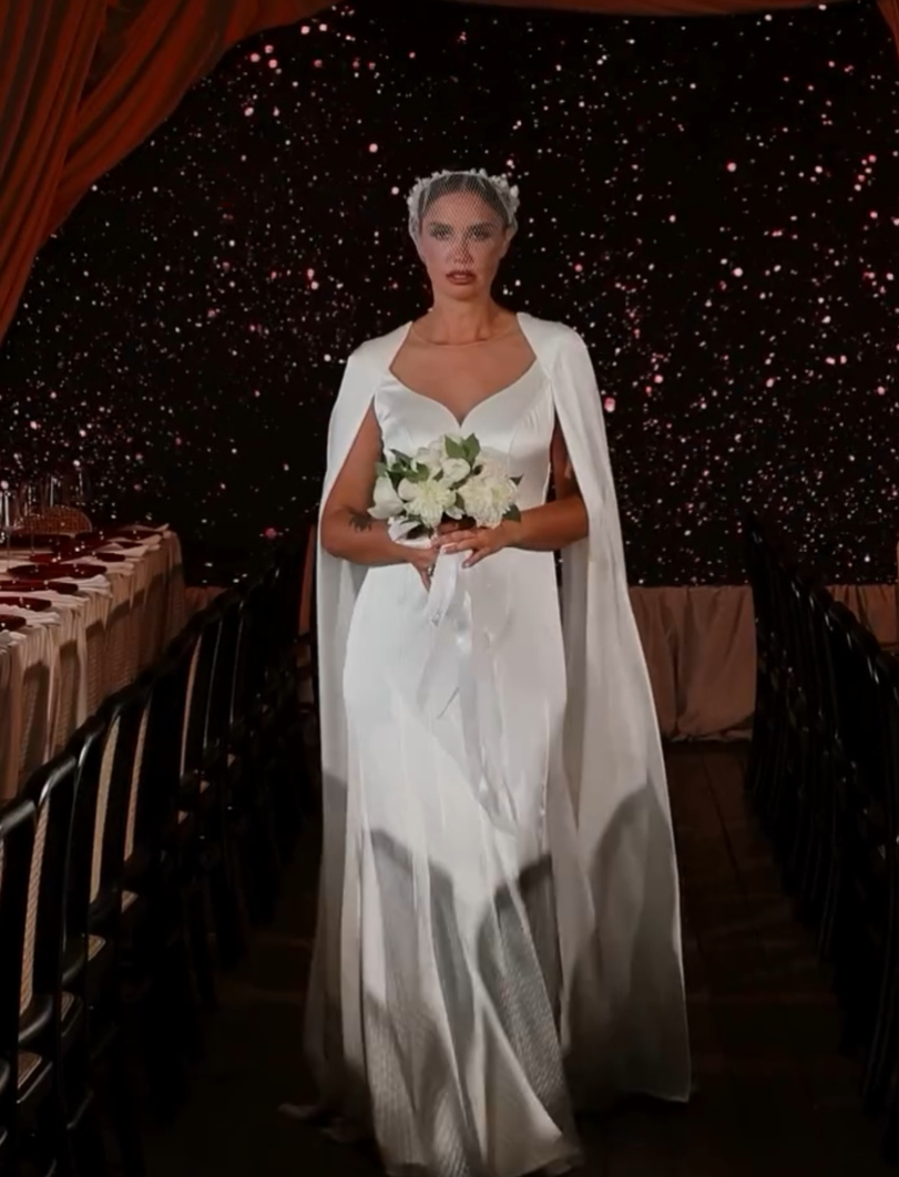 Судя по опубликованным кадрам, пара выбрала выездную регистрацию брака с живописным видом на Москву-реку. Агата предстала перед гостями в элегантном белом платье в пол, украшенном рукавами-кейпами и изящными прозрачными вставками в зоне декольте и на спине. Ее образ дополнила белая сетка для лица, закрепленная на цветочном ободке, и аккуратный пучок волос. Петр Дранга, в свою очередь, выбрал классический темный костюм.