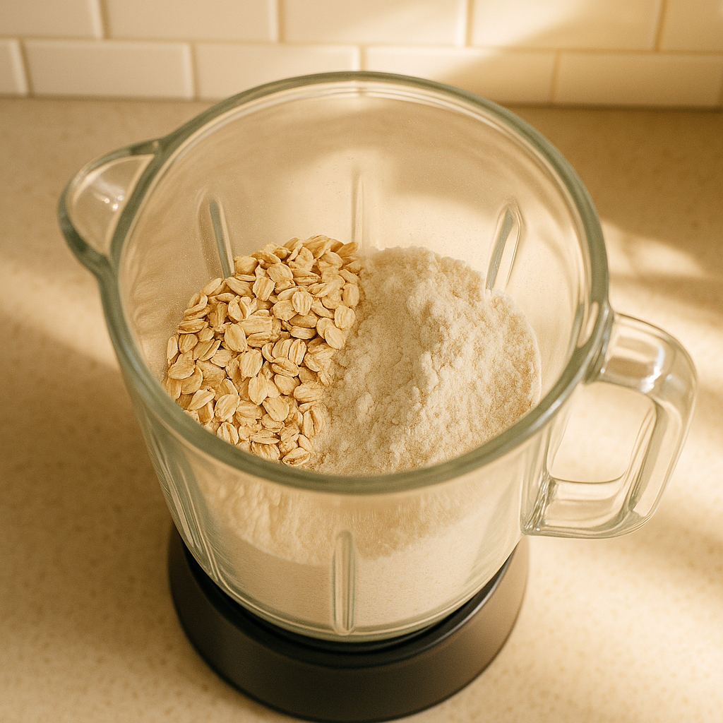 Сначала превращаем овсяные хлопья в муку с помощью блендера.
