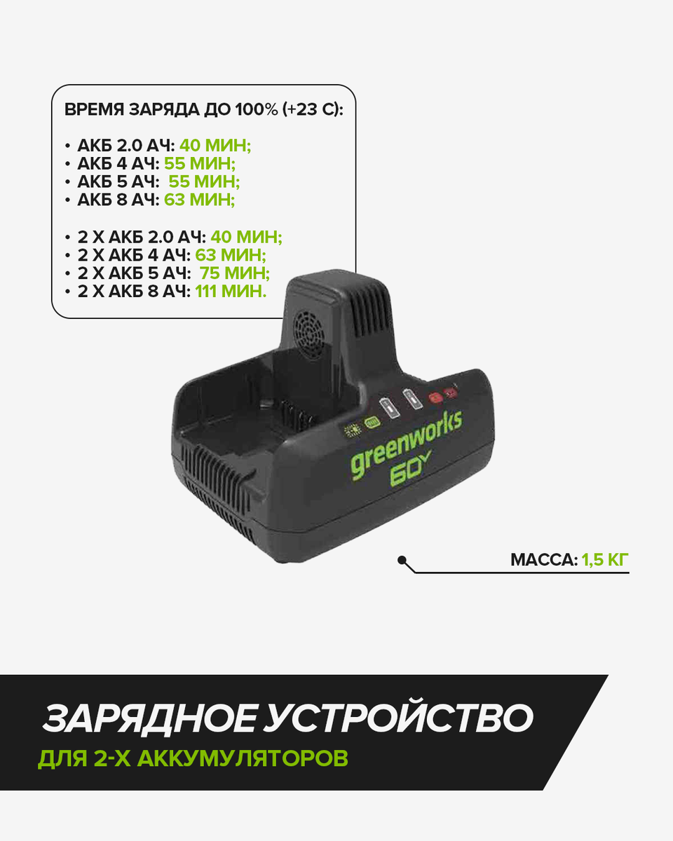 Обслуживание аккумуляторов с зарядным устройством Greenworks G60DC10 (2954407) на 60V станет гораздо быстрее! ✅ Мощное и универсальное: Greenworks G60DC10 — универсальное решение для зарядки всех аккумуляторов платформы Greenworks 60V. Сила тока в 10А и возможность заряжать два аккумулятора одновременно обеспечивают высокую скорость зарядки даже для самых ёмких моделей. ✅ Интеллектуальная система управления: Работу устройства контролирует инновационная система Greenworks Intelligent Power, которая управляет процессом зарядки и защищает батарею от перегрева, перезаряда, перегрузки и глубокого разряда, продлевая срок её службы и обеспечивая максимальную эффективность. ✅ Надёжная система охлаждения: Встроенное активное охлаждение автоматически поддерживает оптимальную температуру, предотвращая перегрев аккумуляторов во время зарядки и сохраняя стабильную работу устройства. ✅ Удобный контроль: Светодиодный индикатор на корпусе устройства показывает статус зарядки в реальном времени — легко