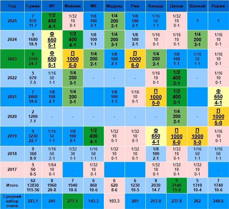 Таким образом, на 7 Мастерсах из 9, средний результат Медведева выше четвертьфинала(200).